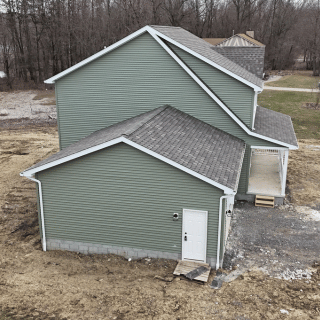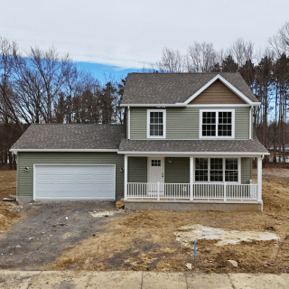 This newly constructed 1,638 square foot, three-bedroom, two and one half-bathroom home features a sprawling front porch, spacious open concept living, dining, and kitchen area, first-floor laundry, second-floor bedrooms, and a detached two-car garage. The full basement is both waterproofed and insulated. Refrigerator, range, microwave range hood, dishwasher, washer, and dryer are included with purchase. Concrete driveway installation and grading and seeding of yard to be completed by builder as soon as weather allows.